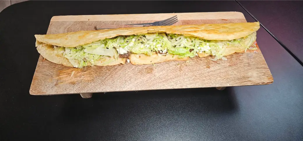 huarache gigante, frijoles, bistec, chorizo, cebollitas, nopal, chile toreado, huevo al gusto, lechuga, queso y crema